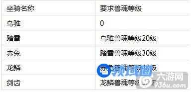 坐骑有四种外观,初始外观为乌骓,通过坐骑升级和兽魂培养后,开放踏雪-赤兔-龙鳞-剑痴坐骑外观。兽魂等级影响下一阶段外观开放,每种坐骑最高等级为10级,升满10级后满足兽魂等级可以解锁下一个坐骑外观,具体资料如下: