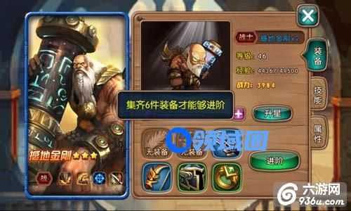 从英雄界面可以看到,英雄信息分为【装备】、【技能】、【属性】三个选卡。其中【装备】选卡显示英雄最常用的信息,包括英雄等级、经验值、战力、魂石数量、装备。点击【+】可以查看该英雄魂石的出处,当魂石累积满后即可为英雄升星;装备栏中可以进行装备穿戴、装备合成、装备搜寻,而英雄的进阶通过积满6件装备来完成。此外,轻轻点击界面左边的英雄插画,可以看到英雄的帅气全幅插画以及技能介绍。