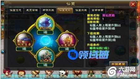 2)聚仙灵殿,用来提升仙盟人数上限,每日福利的产出量和仙盟的等级。聚仙灵殿的等级提升需要先升级蟠桃仙树、仙灵封印、百宝奇阁和一定数量的灵石。