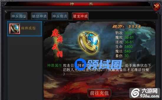 神兵系统分4个功能,分别是神兵图鉴、绝世神装、神兵商店和屠龙神戒。