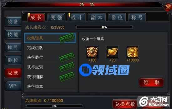成就系统分为6个模块,分别是:成长、变强、战斗、副本、爵位、称号。