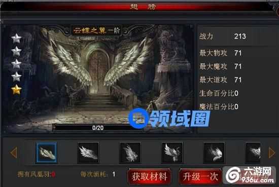 目前翅膀共有10阶,每阶翅膀等级分四星,共四个小等级,消耗“凤凰羽”能够增加经验条经验。每次升星和进阶均可获得大量属性。