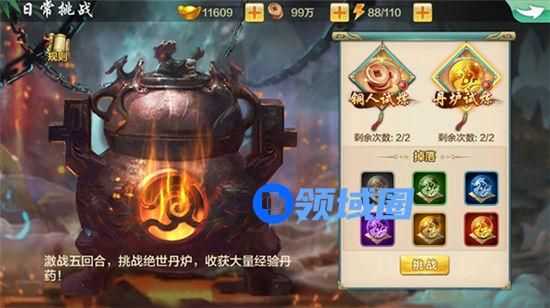 《侠客风云传OL》的日常挑战任务中,目前分为“铜人试炼”和“丹炉试炼”两种,每种任务每天可挑战2次,每日凌晨5点重置挑战次数。玩家可以根据自己的战斗力和等级,自行选择想要挑战的难度等级,难度越高,奖励越丰厚。