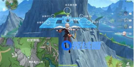 传送厄里纳斯南方向山顶锚点,往地图的东南方向下飞,前往悬崖半山腰;激活图中1个水元素方碑,拾取3个水种子,激活侦测晶体。