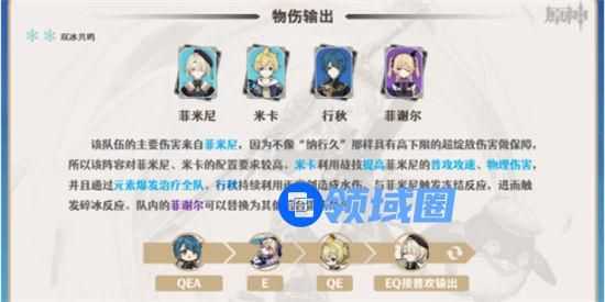 输出顺序:行秋QEA、久岐忍E、米卡QE、菲米尼QE接普攻输出。
