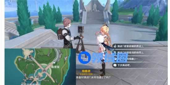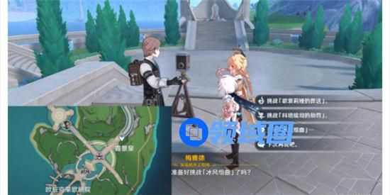 传送露景泉锚点,前往boss「冰风组曲」,选择“挑战「歌裴莉娅的葬送」;开启挑战,躲避其技能,等待30秒后冰风组曲·阴面单独在舞台中间旋转时;水主使用元素战技攻击1次,获得成就「送葬的风暴 」。