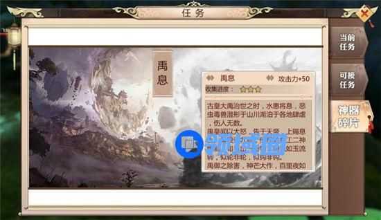 目前开放的神器“禹息”一共需要3张碎片,都可以通过完成主线剧情任务第1章获取。收集满3个碎片后自动拼合成神器,并获得攻击力的加成。