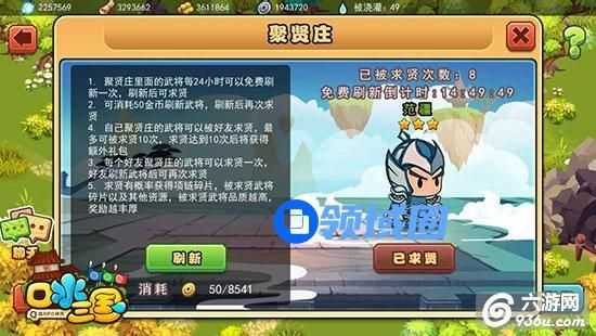 可免费向武将求贤一次,可花50金币刷新;