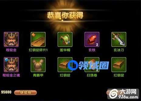 抽铜板10连抽,铜板抽的道具也不错,有紫色武将、包子、铜钱箱子、还有紫色神器宝物碎片喔。抽到的武将直接分解,分解的玉魂可以去神秘商店换取武将魂魄,8000玉魂可以换取10个红将魂,可以用元宝刷新神秘商店。同时,也可以用刷新卷轴来刷新,这样几天就可以弄到想要的红将了。