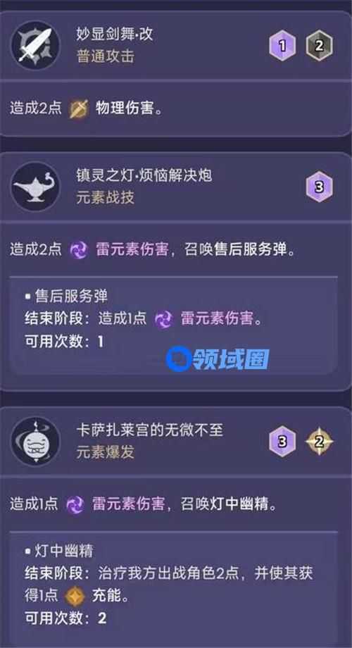 2、元素战技 镇灵之灯·烦恼解决炮:造成2点雷元素伤害,召唤售后服务弹。