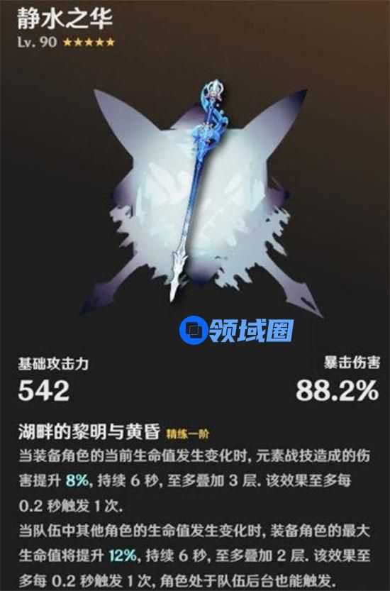 2、武器特效 湖畔的黎明与黄昏:装备角色的当前生命值发生变化时,元素战技造成的伤害提升8%,持续6秒,至多叠加3层。该效果至多每0.2秒触发1次。队伍中其他角色的生命值发生变化时,装备角色的最大生命值将提升12%,持续6秒,至多叠加2层。该效果至多每0.2秒触发1次,角色处于队伍后台也能触发。