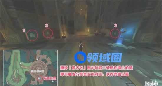 1号宝箱:玩家们传送到下侧的锚点,传送过去之后就可看见这边的墙上贴有三张壁纸,玩家们将他们给撕下来之后就可以和莫普瓦进行对话就能够获得一个普通的宝箱;