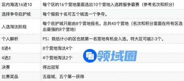 争霸赛由多个营地的玩家一同参加进行PK,一个庇护城最多允许8个营地参加比赛,若满64名玩家则开启64名营地争霸,若未满,则决出前16名玩家。