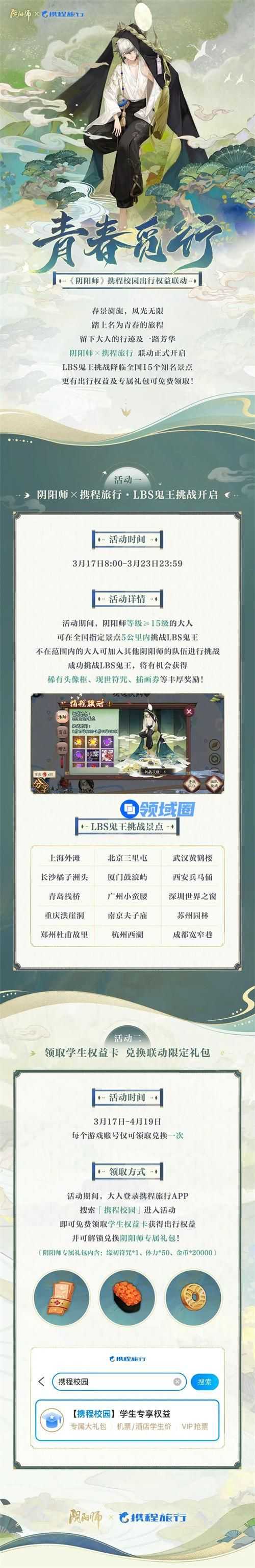 ※活动详情:前往携程旅行APP,搜索「携程校园」进入活动,即可免费领取学生权益卡,解锁兑换阴阳师专属礼包。