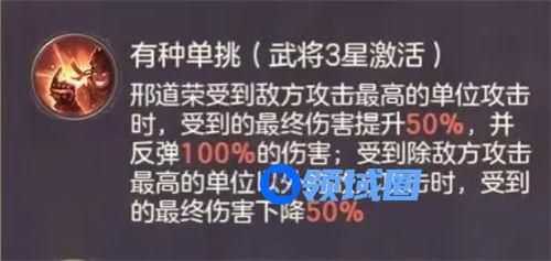 略有小成:有种单挑效果提升至:邢道荣受到敌方攻击最高的单位攻击时,反弹150%的伤害,受到除敌方攻击最高的单位以外的敌方攻击时,受到的最终伤害下降50%,并回复自身50点怒气,每回合最多回复300点。