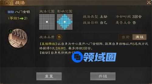 以自身为中心展开八门金锁阵,距离自身四格以内5名我军武将获得1次【抵御】,最多持续2回合。【被动】自身免伤提升1.3%~13%。