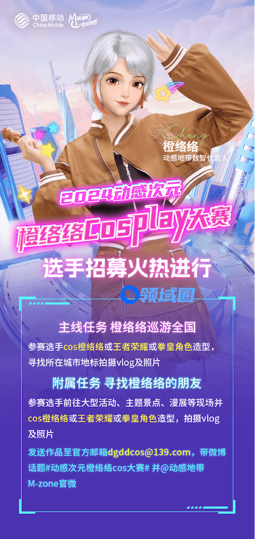 同时,2024动感次元橙络络cosplay大赛也在火热进行中。参赛者需cos橙络络或王者荣耀角色或拳皇形象,在城市地标拍摄视频/照片,发送作品至官方邮箱,并带上微博话题#动感地带橙络络cos大赛# @动感地带M-zone官微即可参赛。线上海选赛成功晋级者将有机会进入动感地带5G校园先锋赛分省线下赛,最终晋级全国总决赛,获胜者将成为橙络络官方coser,并获得万元大奖。