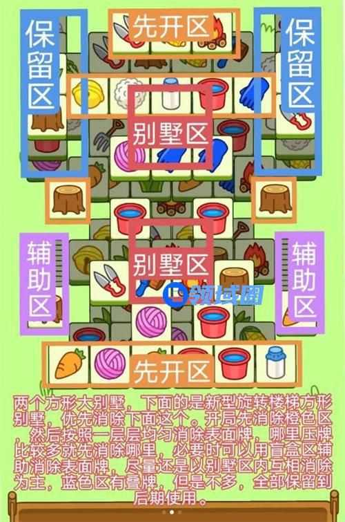2、开局先消除橙se区的牌,这里压牌。尽量要让牌面保持在同一水平面,然后一层一层消除表面牌,不要跨层太多拿牌,等表面牌消除完后,以大别墅内互相消除为主。