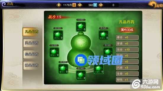通过收集丹药碎片,抢夺其他玩家身上的丹药碎片,凑齐三个同类的丹药碎片,就可以炼制成一个完整的丹药,丹药的属性随机出现,有攻击、命中、防御、生命、韧性、闪避、穿透、暴击八种类型,丹药品级越高,种类越少。