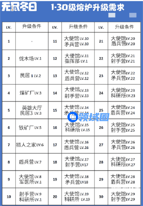 1、无尽冬日炉子(大熔炉)的升级表如下: