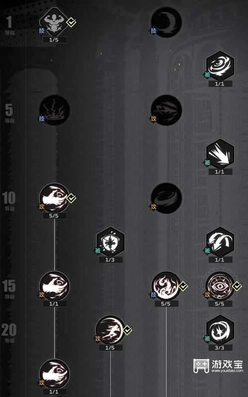①主动技能:优先点满「黄昏引导者」核心技能,利用「黑暗钉刺」和「黑暗捕食者」进行远程消耗的同时,找准机会使用「恶神之手」或「黑暗疾走」创造出近身战斗的机会。