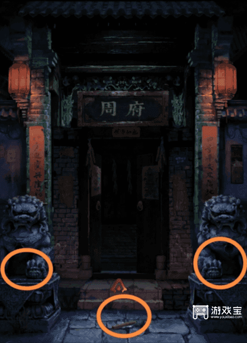 获取火折子和阳玉佩:在周府门口可以捡到未点燃的火折子,同时,在门口左边的石狮子身上可以找到一块阳玉佩。