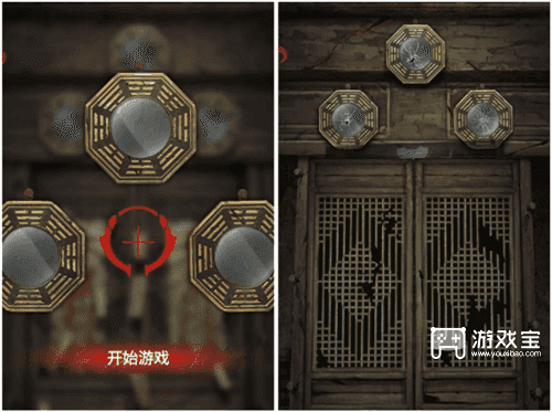 移动铜钱盒子:根据走廊窗户上的4个铜钱的上下位置,移动屋子里台阶上的铜钱盒子,可以打开盒子。