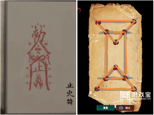 获取止火符:点开镜花水月这本书,翻到止火符这一页。将黄纸放上,选上毛笔开始玩游戏,可以获得止火符。