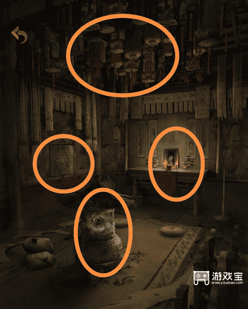 铜钱解谜:用铜钱分别点击这些符号,绿意场景厨房柜子里显示“肆”,厨房火炉旁边凳子上的符号显示“伍”,厨房门口盆景上显示“叁”,秋枯场景病人房间左侧柜子里符号显示“贰”。