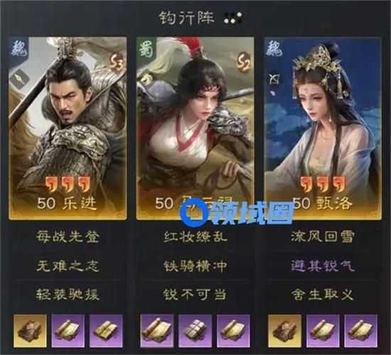 此队的马云禄红度与爆发效果息息相关,白板的话只能打兵刃内战,对阵法师略显乏力。乐进和甄洛的双增伤能让马云禄变身一拳超人。马云禄自带战法红妆缭乱基础就有70%的发动率可以保输出下限,而铁骑横冲的高倍率可以拉高队伍输出上限。
