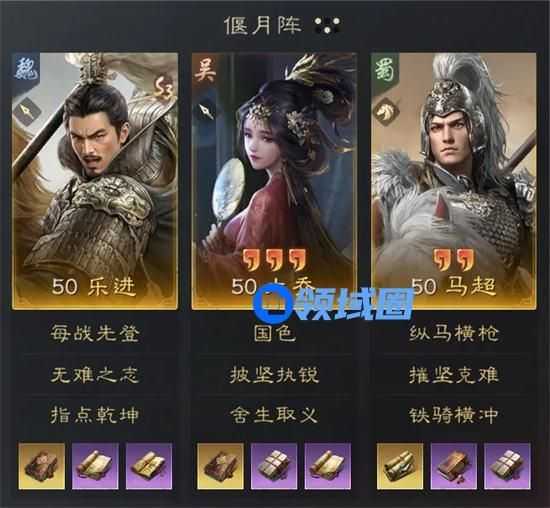 此队相比于乐进吕布来说一是有摧坚克难的稳定触发;二是乐进和马超通过偃月阵站前排可以充分发挥乐进的每站先登的效果;另外有了大乔的治疗后也有一定的恢复能力,对于连穿是有帮助的。