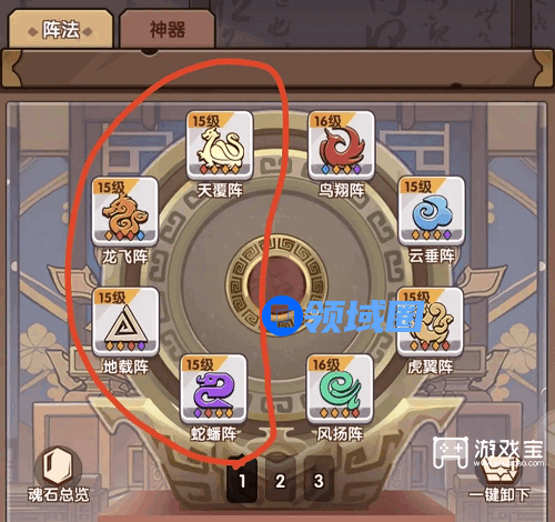 首先,阵法系统有8种阵法,每个阵法最多可以装4种宝石。每种阵法装的宝石效果的范围是固定的。阵法前4级每级解锁一个宝石孔,12级开启阵法洗练(洗练比较后期等玩到后面你自然知道要洗成什么样),所以我建议每种阵法的等级先均衡升到8级!然后优先把天覆阵、龙飞阵、地载阵、蛇蟠阵升到12!这点很重要!,阵法自选袋优先用来升这四个阵。