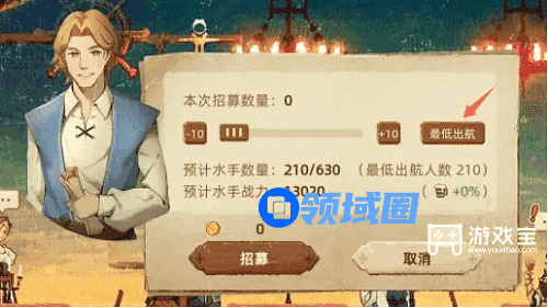 ③出航时,如无必要,不需要把水手拉满,只要拉到 [最低出航] 量即可。在招募界面点击 [最低出航] 就可以自动设为最低出航人数,招募界面默认打开也是最低出航人数。