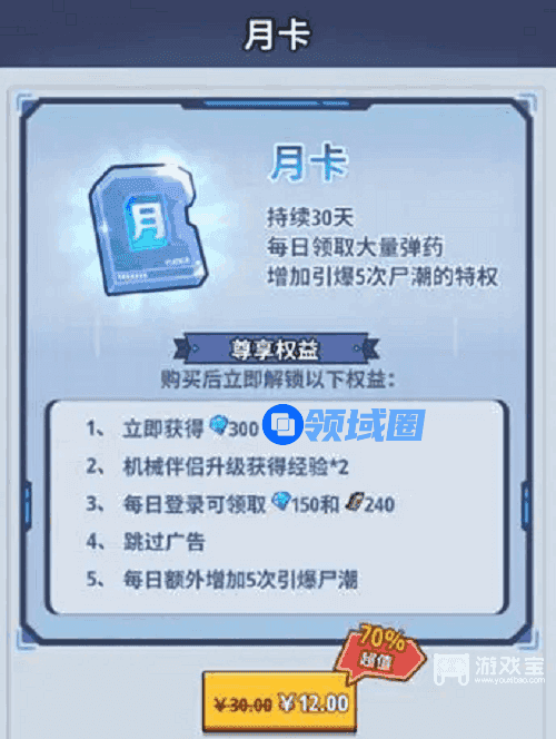 月卡,开服前三天可以以12块钱的价格拿下30块钱的月卡,还要什么自行车,而且月卡的重点不只是累计4800的硬通货道具【钻石】,主要还有累计7200的【弹药】和跳过广告的特权,最最重点的还是能增加5次引爆尸潮,了解这个游戏的玩家都知道,一个月能比别人多150次引爆尸潮的机会就意味着能够比别人提前一周甚至半个月拿到更多高级装备;