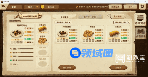 当前的饮食结构,就是当前这个城市的人们在吃什么。游戏会显示出当前城市的四项营养评分以及口味评分的值。