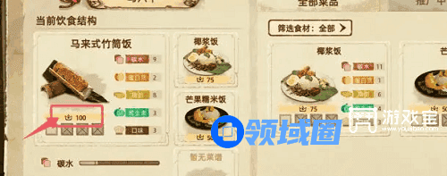 每个菜品都有一个重要的值 [接受度],会以小皇冠的形式显示在这个菜品的下方。如图所示,马来式竹筒饭的接受度是 100%,椰浆饭的接受度是75%,以此类推。