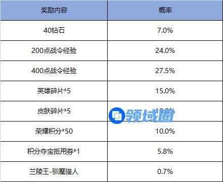 打开可随机获得以下奖励之一:兰陵王-驯魔猎人、积分夺宝抵用券*1、英雄碎片*5、皮肤碎片*5、荣耀积分*50、200/400战令经验、钻石*40。