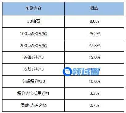 打开可随机获得以下奖励之一:周瑜-赤莲之焰、积分夺宝抵用券*1、英雄碎片*3、皮肤碎片*3、荣耀积分*30、100/200战令经验、钻石*30。