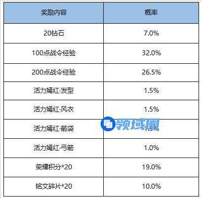 打开可随机获得以下奖励之一:活力嫣红·发型、活力嫣红·风衣、活力嫣红·箭袋、活力嫣红·弓箭、荣耀积分*20、100/200战令经验、钻石*20、铭文碎片*20。