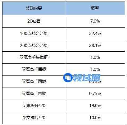 打开可随机获得以下奖励之一:驭魔高手头像框、驭魔高手荣耀播报(永久)、驭魔高手回城(永久)、驭魔高手击败(永久)、荣耀积分*20、100/200战令经验、钻石*20、铭文碎片*20。