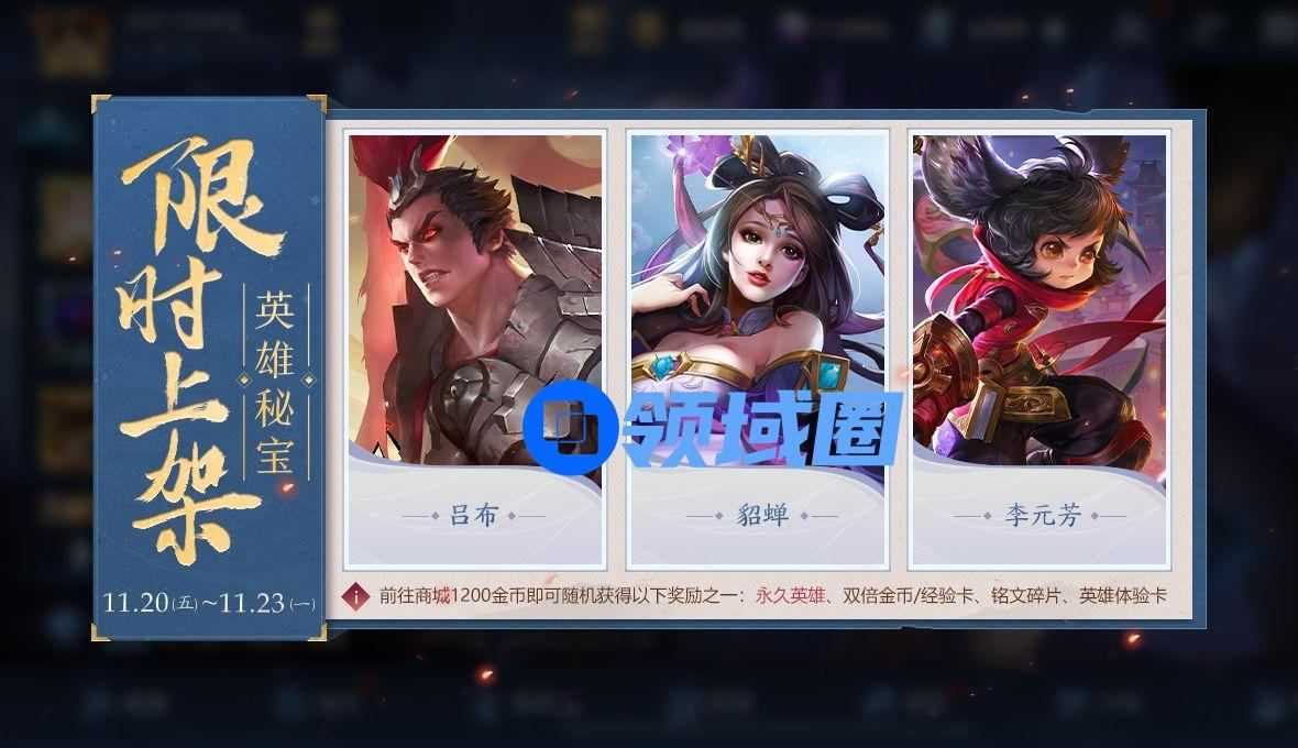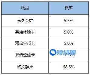 打开后可随机获得以下奖励之一:吕布、貂蝉、李元芳、英雄体验卡3天、双倍金币卡:1日、双倍经验卡:1日、188/138/108铭文碎片。