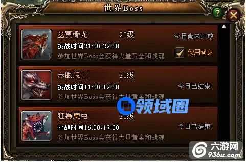 在世界BOSS的开放提示面板中选择的“使用替身”,即可激活“替身”代替你参与世界BOSS的战斗,不再错过任何一场世界BOSS。