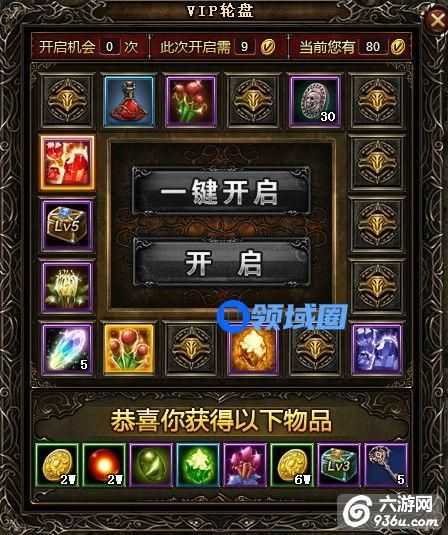 开通VIP后可以使用VIP币打开VIP轮盘,开启VIP轮盘可随机获得VIP轮盘上的物品,高级宝石、海量黄金战魂、农场种子、灵魂水晶、兽灵石、迷宫硬币……精彩多多,惊喜不断!