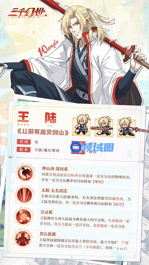 王陆智商超绝擅长玩弄敌人掌控全局。战斗开始时,降低敌方全体一定百分比攻击力(不可驱散),持续一定回合。王陆死亡后会以一定生命值复活,并为自身附加【运筹帷幄】,每场战斗触发1次