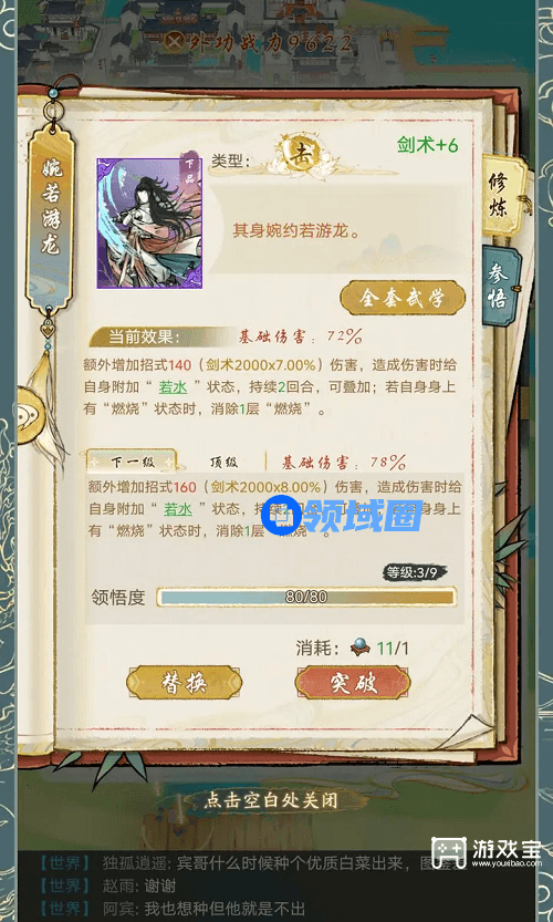 参悟可以快速提升外功的威力,但消耗资源较多,需合理分配。