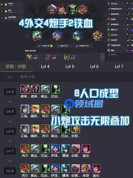 5-5左右上8,用盖伦换任意除吸血鬼以外的低质量监察棋子,安蓓萨换艾克,补娜美开2法师,组成标准阵容。如果没有盖伦/安蓓萨开不出4外交,可以先用4炮手或者兰博+哨兵