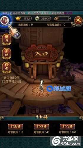玩家每天从千层楼第一层开始向上挑战,可以选择三种不同难度的挑战方式,从低到高分别为“打两层”、“打四层”、“打八层”,难度越高,挑战胜利后可获得的积分越多。需要注意的是楼层高低和战斗胜利可获积分多少无关,只与挑战方式的难度相关。