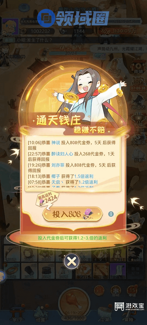 3、要控制住推图欲望,保证战斗力能溢出精英怪才比较好刷元宝和铜币。