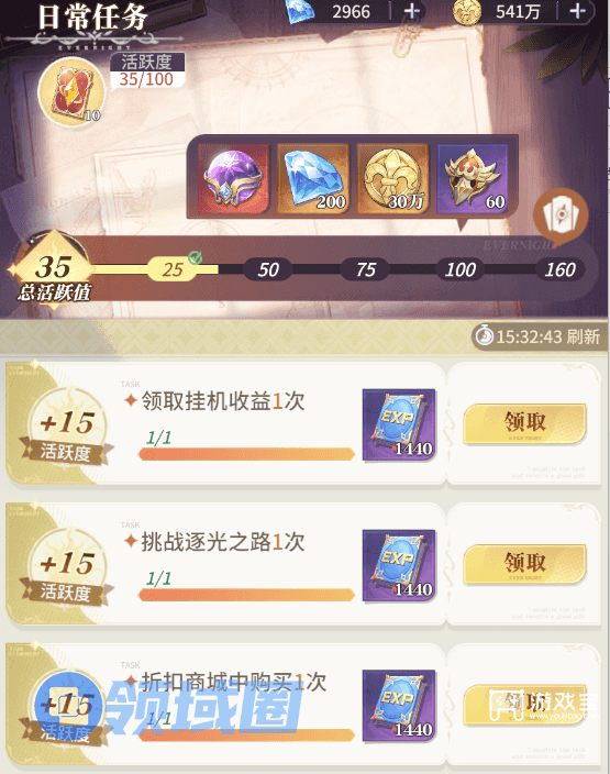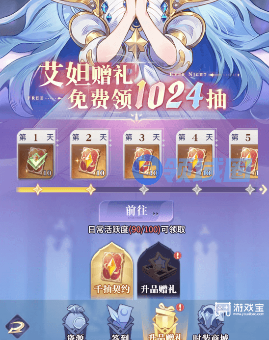 每天上线必完成160活跃度,获取契约卡牌、契约水晶、钻石等重要资源;同时,每天100活跃度可以领取10抽契约卡牌,持续100天左右