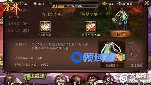 通关技巧:不要使用一成不变的阵容,根据关卡的描述调整自己的阵型,将有实力的神仙放在上路,优先击败对方的治疗,否则就会陷入越战越苦的境地中。